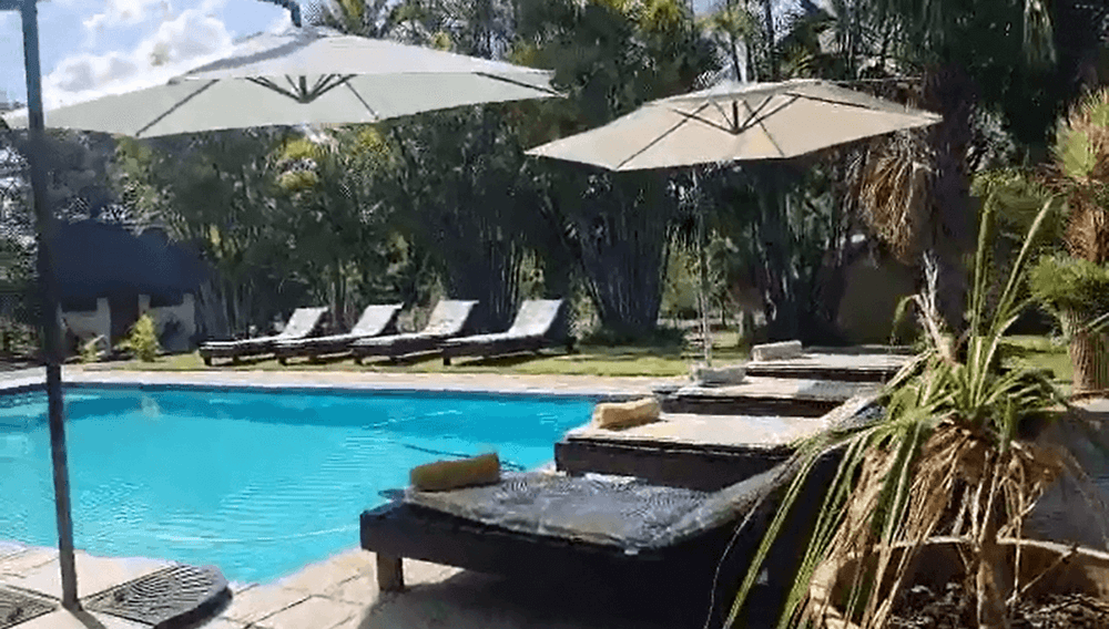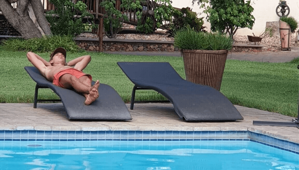 Der er en fælles swimmingpool på lodgen og hver dag lægges rene badehåndklæder frem på liggestolene.